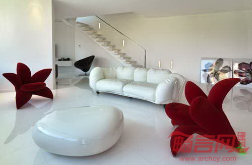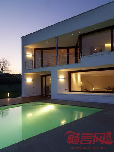 建筑呈一字形排开,厨房位于一端。建筑北面包含了较为私密的空间,南侧是泳池,潋滟了一尺碧波。起居楼层是洁白无瑕的空间,稍做点缀的化石墙壁的质感和部分家具上的彩色斑点。