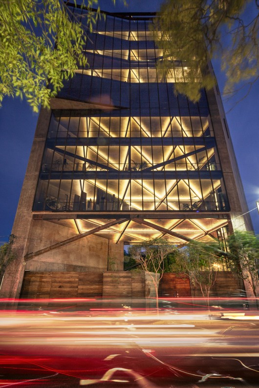 41大厦位于墨西哥城战略要地,面朝壮观的Chapultepec公园。建筑由TAX建筑事务所设计,共有7层,面积1820平米。在周边环境中,大楼在夜色中如同一座光影雕塑。室内空间根据建筑结构设计,两个结构混凝土墙面支撑了不锈钢夹层,外立面二级钢结构加强了该夹层。