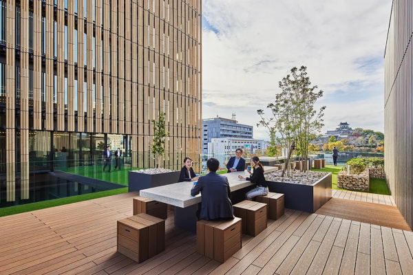 解决方案提出了一个对日本传统建筑进行现代化诠释的工作场所:以类似檐廊的过渡区域环绕起居空间,起居空间则用隔扇、拉门等可灵活变化的隔断进行松散分隔。设计打破“办公室=无柱大跨度结构”的盲目信仰,将外围立柱偏移5米,实现了在结构上解放外围区域的嵌套状平面布局。将作为内外部过渡区域的外围区域视为“檐廊”,将被檐廊包围的内部区域视为“起居室”, 由此营造出环境各异的场所,从而为工作场所提供了多样化的选择。