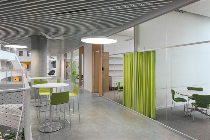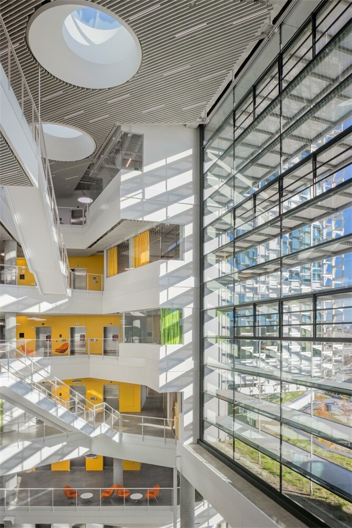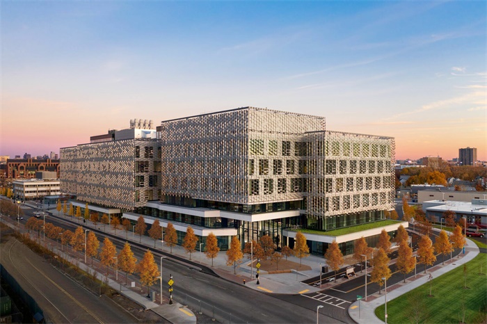 这座八层楼高、54.4万平方英尺的建筑,被设计成三个四层体量的组合,由两个多层通高玻璃中庭相连,为师生打造出光线充足的社交中心。上层的外立面采用分层式设计,令构成建筑内研究活动的大尺度空间标准化,创造建筑自身的标识性,并在建筑高效的能源特性与使用者的舒适度上发挥着重要的作用。