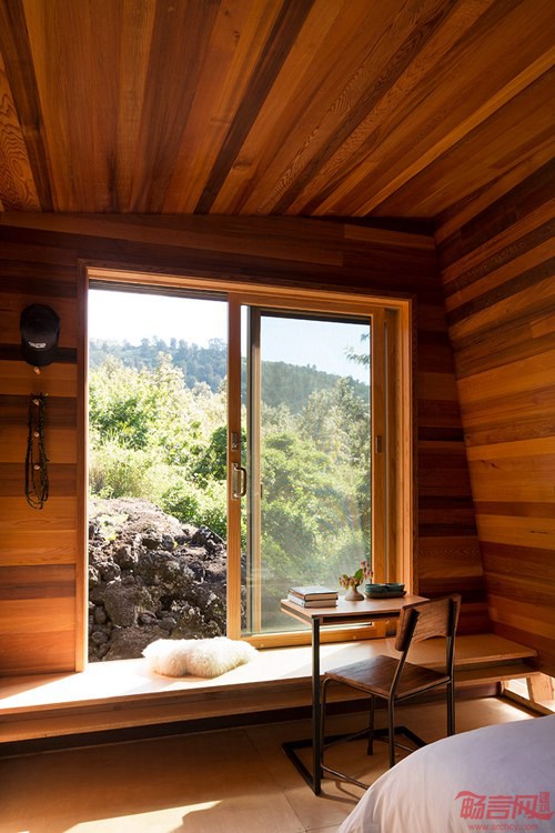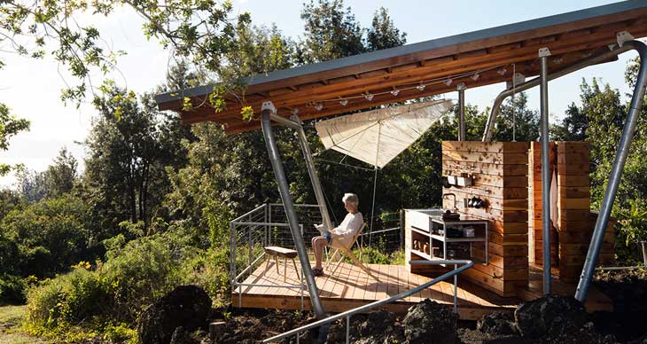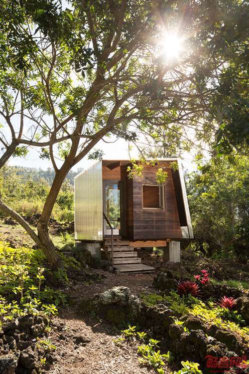 FLOAT工作室设计了一座“室外住宅”,位于夏威夷Maui老火山熔岩流上方。两座小型建筑中,一座全围合,一座和室外互通,同室外景观和自然环境建立了紧密的联系。受到FLOAT2009年设计的Watershed工作室的启发(100平方英尺的小房子),业主要求建筑能和次热带景观互相融合。围合建筑名为Mauka,包含狭小的独立卧室,可以欣赏熔岩和日出。具有遮盖的住宅提供私密性,白天住户可舒适地阅读和打盹。