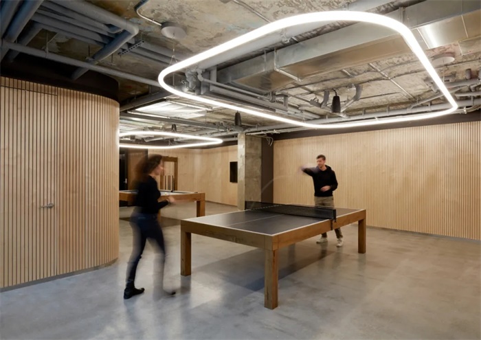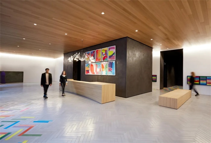大楼入口处的设计灵感来自于远古时期的岩画。玻璃门向内部凹陷,形成一个浅浅的洞穴,天地墙都铺有充满活力的彩色条纹装饰,与黑色的外墙石材形成鲜明对比。