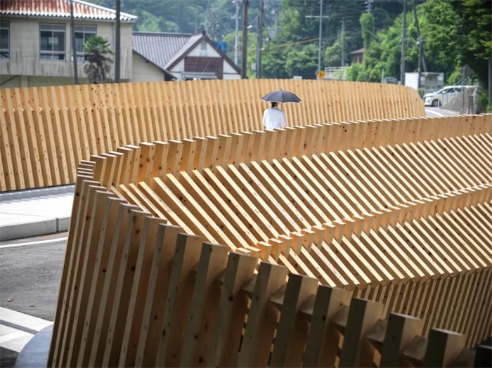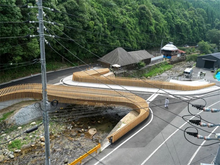 考虑到桥梁时常面临的灾害风险,钢筋混凝土框架与柏木材质的护栏结合在一起。木质单元的排列创造出柔和的曲线,呼应了周围山脉的轮廓。护栏采用的“105角”构件是日本木结构建筑中最常用的构件尺寸,这也为桥梁赋予了一种具有怀旧感的人性尺度。