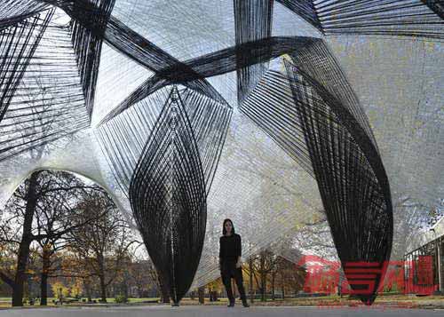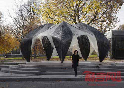 斯图加特大学科研人员受龙虾骨骼启发,利用机器人将60km长度的碳玻璃纤维细丝缠绕在一栋研究场馆上。