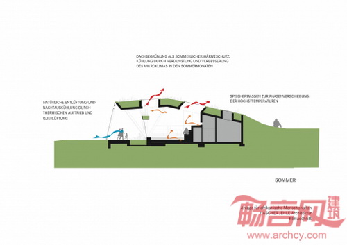 山顶表现成景观的一部分,而非建筑本身。建筑和绿化相得益彰,建筑成为公园的地形基础。