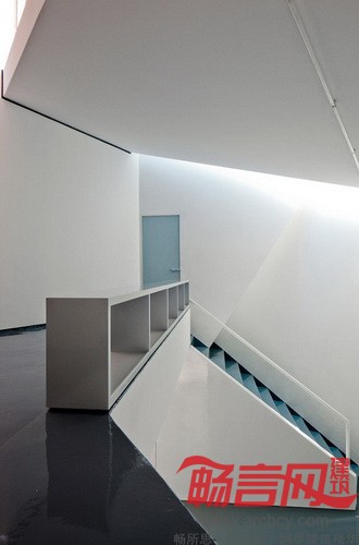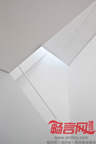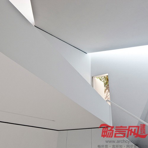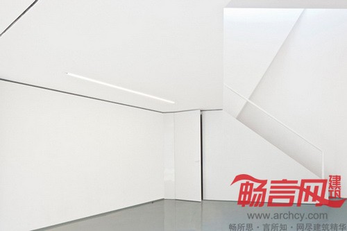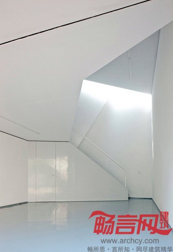 倾斜的屋顶将工作区域与阳光隔开,同时也将均匀光线从天花板上方放进来,使之洒满上下层的空间,也从感官上放大了室内空间。
