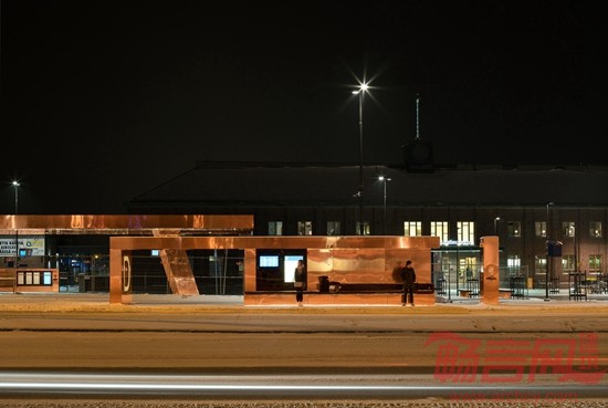 该游客中心包括一个60米长的天棚,用作长途汽车站台,一个封闭式的升降梯结构,还有市内公共汽车站台。此外,整个游客中心也为这座城市增添了一道风景线。游客中心的主要建筑材料是铜、玻璃和铝材,为了符合周围的环境特点,建筑师选材很用心。天棚和柱子由打孔的铜板包覆,旁边的升降梯的外墙和承重结构都采用了玻璃材料。玻璃壳体内是升降梯轴,由铜板和铜丝包覆。