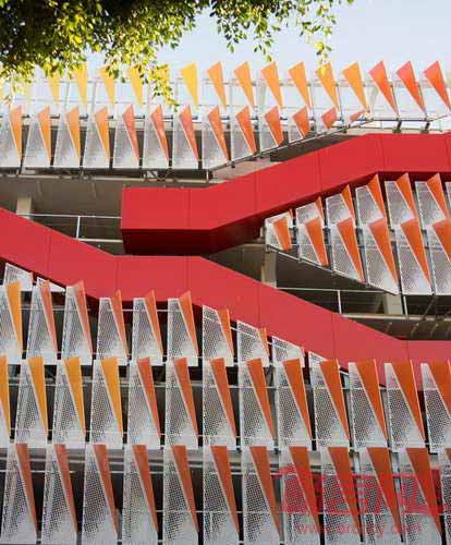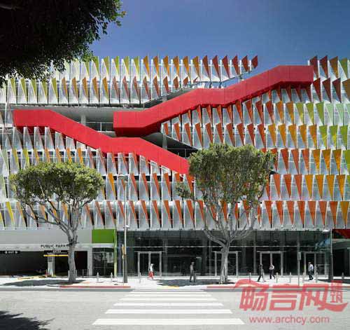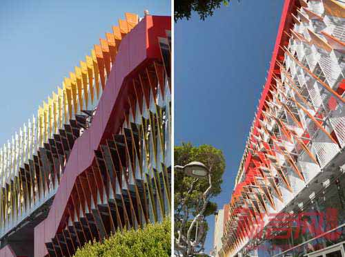 Behnisch建筑事务所同Jantzen工作室合作,共同设计了圣莫尼卡6号停车场项目,满足这一洛杉矶海岸城市市中心当地人及游客的停车需求。停车场所在区域涵盖多种活动,包括零售店、行人、骑自行车者、摩托车手和植物景观,同时包含休闲设施。停车场设计旨在提升城市活力,其外立面充满表现力,空间设计活泼。建筑外立面包含五彩斑斓的金属表皮,配合视觉醒目的室外楼梯。
