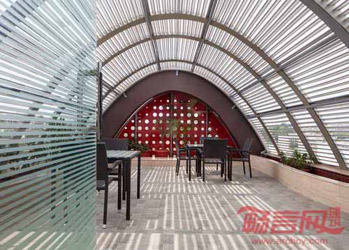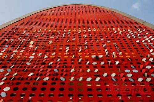 ANAGRAM建筑事务所设计了为印度新德里一家主流户外媒体广告公司设计了新办公楼。设计方研究了建筑表达和品牌个性的潜能,设计出这座名为“数字”(THE DIGIT)的建筑。项目呈现出半椭圆形,临街外立面设有红色像素化遮雨板,通过若干旋转的碟片展示了公司的LOGO、字母P。随风力舞动的碟片构成了动感元素,不仅吸引路人的注意力,成为公司在大马路上的“公告牌”,同时彰显了公司、大厦和员工关系的深层价值和内涵。