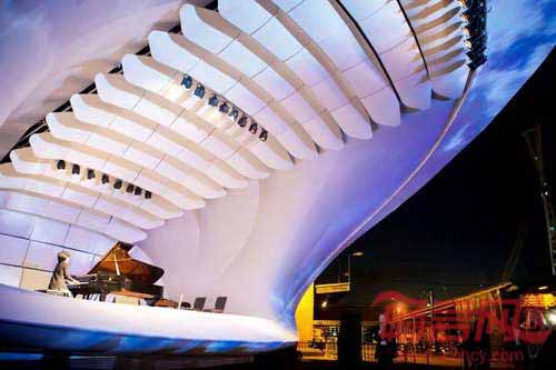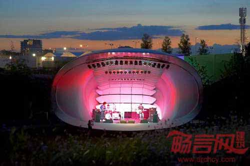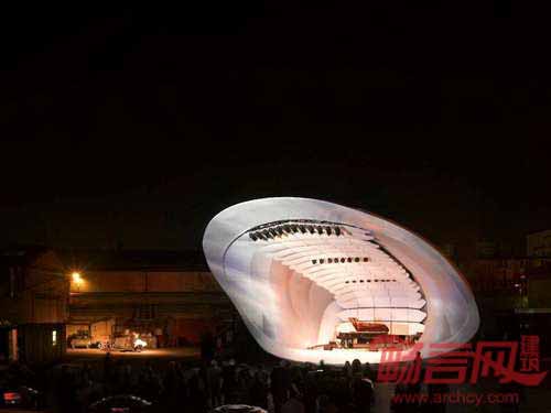 BFLS建筑设计公司和Arup声学设计公司合作设计了一个移动舞台,其无以伦比的音响效果会令世界各地的观众与演奏者折服。铝框结构建筑形同包裹了阻燃材料的贝壳,室内添加了木质板材,提升了音效。