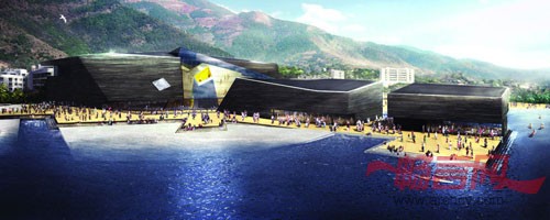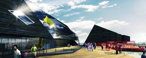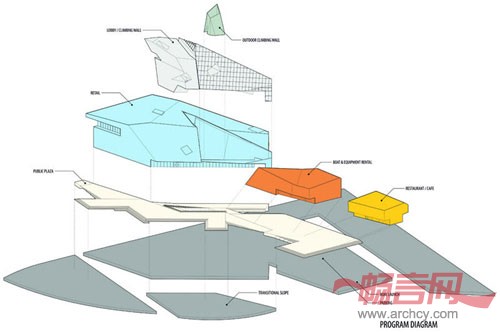 该建筑群包含三座建筑体(一个休闲商店,一座设备租赁建筑和一家旅馆),概念性地从一个整体中分开,又由一个公共广场进行重新组合。该项目的石材外墙建设采用了当地的材料,但建筑最主要的审美亮点便是带有户外攀登墙的玻璃覆面空间。在这个玻璃覆面的空间里面嵌入了另一个圆锥形空间,所有的这一切都包含在建筑的整体结构中。朝南的广场的边缘向南湖的水域倾斜,这样游客就可以到水中去划船或者游泳。该项目预计于2012年夏天竣工。