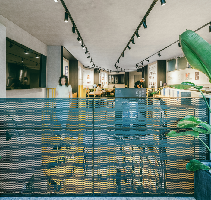 场地内现有最强势的垂直向元素——旋转楼梯被保留下来,和入口挑空空间产生互动,打造了一面通高的“亚洲书单”,两者形成了一种围合关系,也有效的将一、二层空间建立了联系。旋转楼梯自然将二层切分成两部分,沿街一侧留出一个可以俯瞰街景的小“露台”,通过走道与内部相连。这一段垂直向的联络空间,成为整个空间的视觉焦点,同时构建了一种强烈的特质性,以在一个小空间内彰显出“亚洲书店”的昭示性。