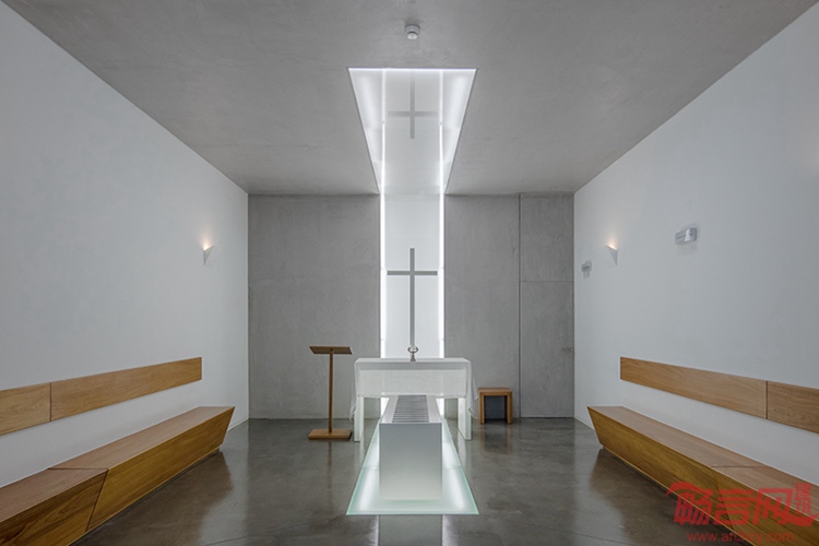 Plano Humano完成了全白的葡萄牙牧灵中心。项目位于Moscavide,涵盖口授经文房、殡仪馆、教区住宅。由于临近Santo Antonio教堂,后者是当地一座建筑遗产,两座建筑成为体现两个不同时代的地标。尽管截然不同,却相互辉映,成为社区的参照点。阳光可照进复活礼拜堂,营造出飘逸的氛围。