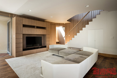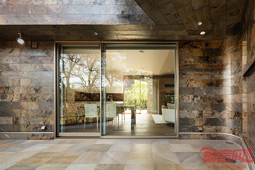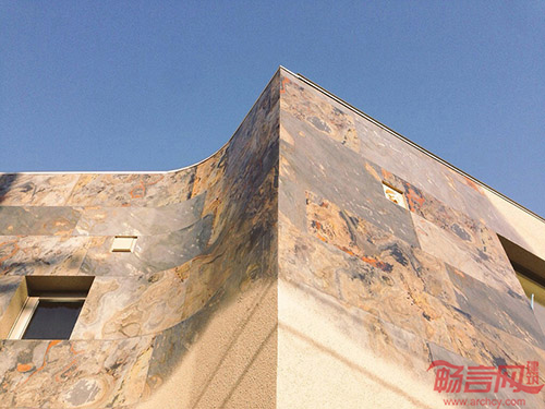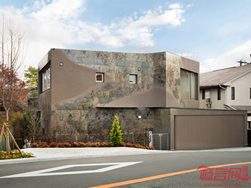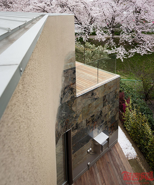 Triton住宅位于日本大坂市,旁边是一排樱花树。房子的特别之处在于它的外立面装饰,混合使用了彩色喷砂和1毫米厚度的石板,两种材料交融在一起,形成了一个平滑、有石材质感的外立面。