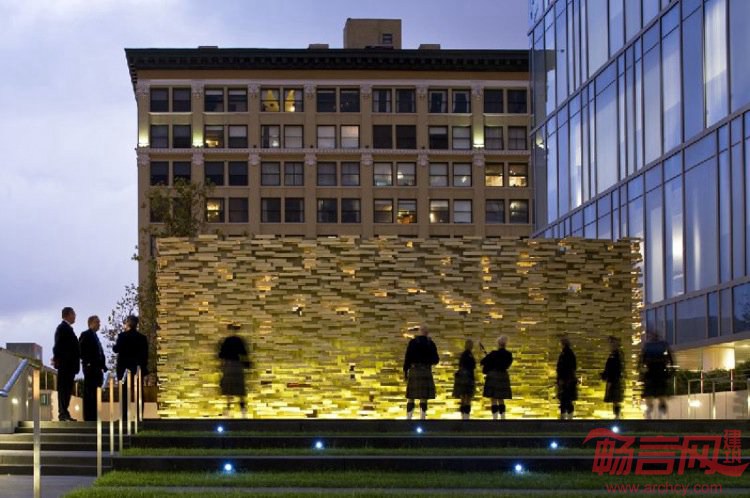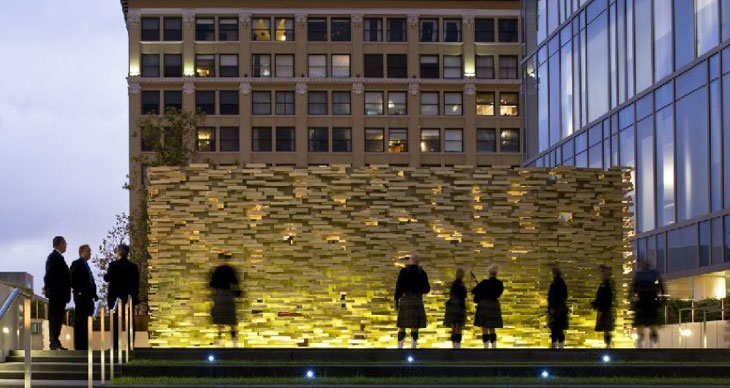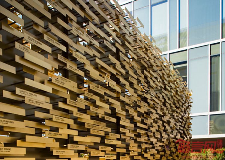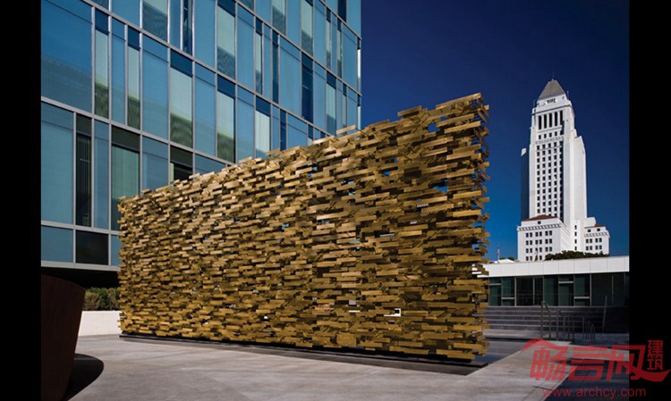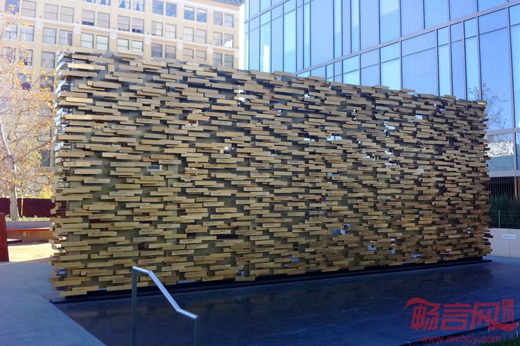 项目设在洛杉矶警察局总部的醒目位置,纪念馆为执勤中殉职的警察致以哀悼。从较远的距离看,纪念馆如同一面坚实、富有质感的墙壁,传递出公共事务的公共目的。走近一些,不同警察的名字清晰可辨,这些铜质铭牌上共有超过两千个名字,铭牌令人联想起执法人员的警徽。选址介于一个活跃的入口空间和纪念公园之间,纪念馆居于中间,象征了警察作为社区调停人的日益重要的作用。