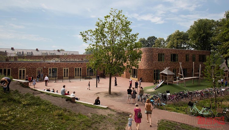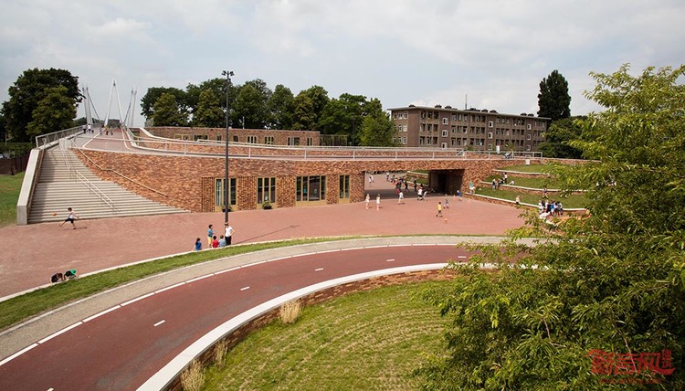 当骑行者从乌特勒支中心通过 Alogo Al 地区到 Leidsche Rijn 的新区时,一条长长的弯道引导骑行者上行穿过维克多雨果公园,然后通过学校屋顶上方的屋顶花园。NEXT建筑事务所的建筑师Marijn Schenk称:“在一个流动的循环的路线中,公园和学校被组合在一起,形成了一个连贯的基础设施,完美的结合了建筑和景观。”