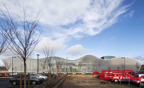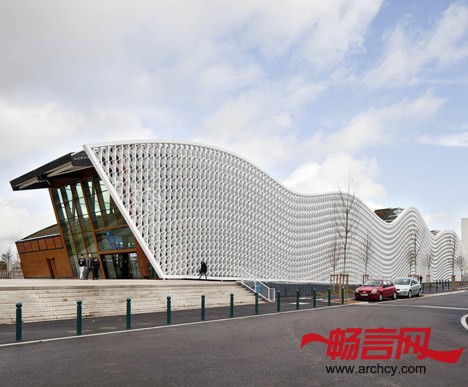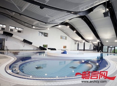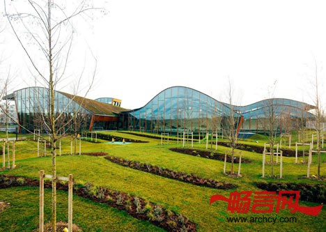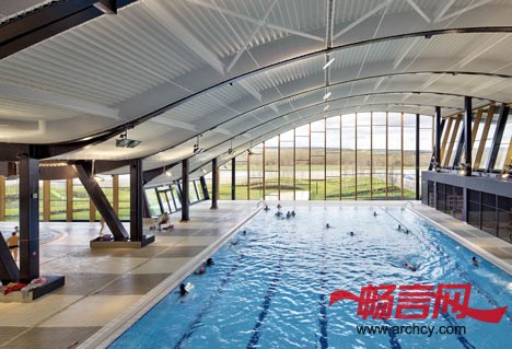 1. 大景观。从体育中心绝佳的建筑地点能看到Vexin山坡上的美丽风景。中心波浪形的绿色屋顶与塞纳河对面连绵的小山相互呼应。设计师将建筑本身就构想为一个景观,让它能加强使用者与周围自然环境的联系,无论人们身在建筑室内还是室外。