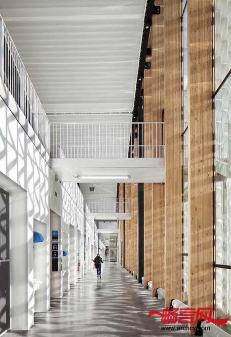 2. 过滤器。作为城市与自然之间的连接体,Mantes-la-Jolie水上运动中心的结构中有很多个透明的元素,首先就是朝向城市一侧幕墙上的格子,透过格子上的小孔,外面景色就进入了室内。格子上的小孔、排列的渐变、室内外的无界将Vexin山和Val-Fourré住宅工程融合到一起,也将所有的设施都对小区开放。这样渐进的过滤营造出了一种宁静、微妙的氛围。