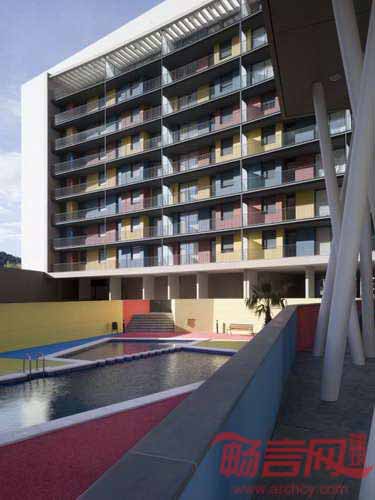 163住宅商铺项目位于西班牙巴伦西亚Sagunto开发区内。除了Palencia河大桥连接的老城区结合部外,该区域密度较低,建筑高度要求低于三层。项目主要难度在于克服高密度,满足开发商要求的较多的住宅数量,因而要求符合每个房间采光需求的较大的周长。项目的重要目的是提供商业空间,并设计包含泳池在内的大面积公共空间。设计师设计了三座大楼,一座阻隔北部主要风向的纵向建筑,以及增加连接空间的两座部分挑高的建筑。