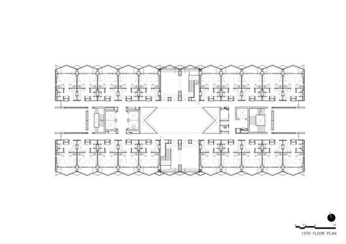 设计团队决定设计新宿舍的布局,以便与三栋现有建筑物互动,从而创建一个封闭的庭院,与医院拥挤、繁忙的氛围隔开。建筑物的底楼是一个连接主干道和庭院的开放空间,隐喻地充当了通往这个宁静和平住宅区的门户。