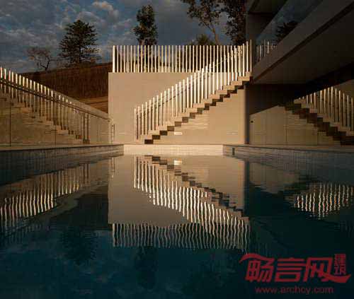 建筑后立面具有叠放的悬臂屋顶,西立面通过一排垂直杆支撑屋顶,跨越了从一层平台到二层阳台的距离。水泥外立面配合了浅棕色铝合金窗户、玻璃移门和遮阳百叶窗。入口和石灰华地面使用的材质使室内的装饰风格得到了统一。建筑入围了2012年国际建筑节的别墅类奖项。