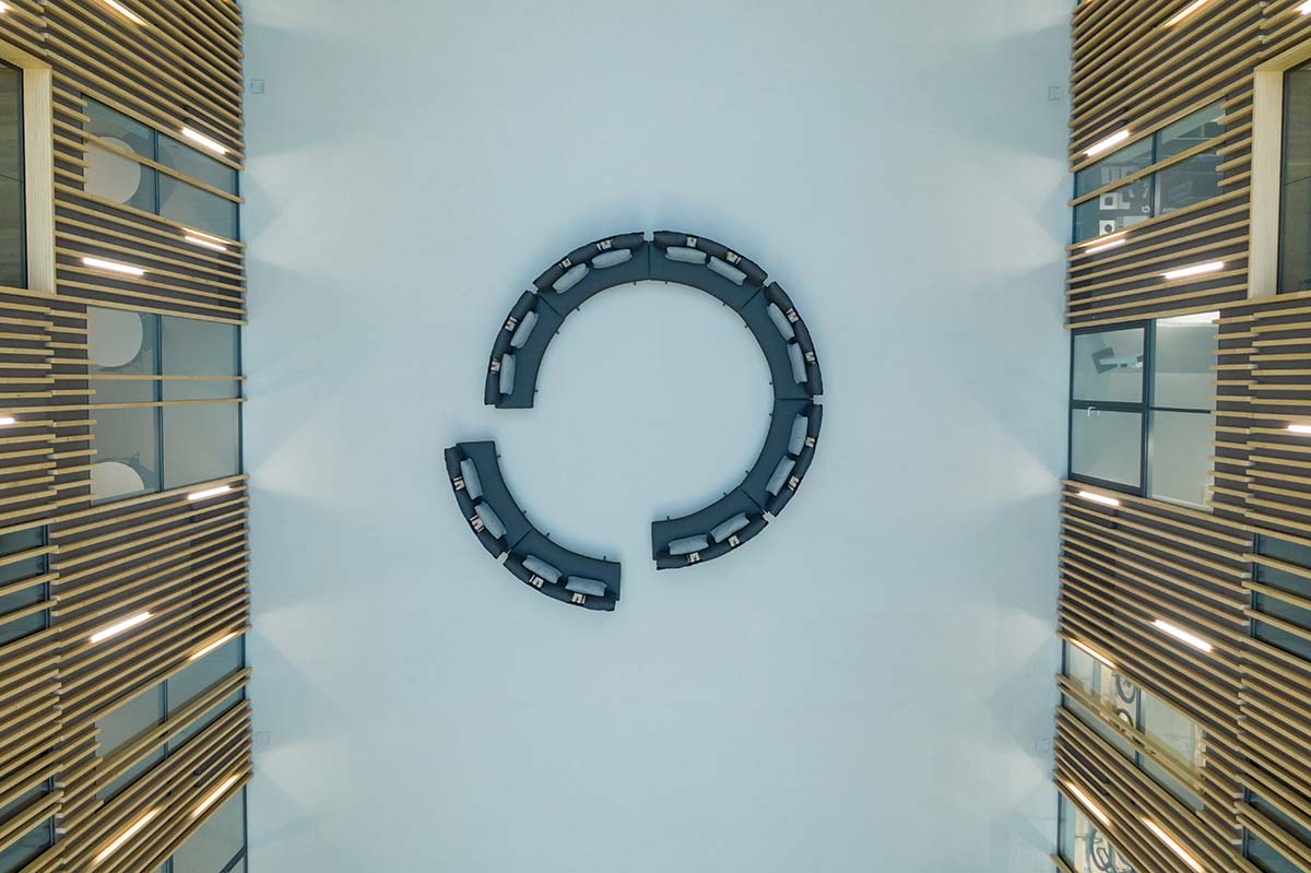 建筑立面选用了铝材,以此纪念公司的第一款产品——铝制滑雪杆。到达新总部大楼后,人们可以进入到一处通高中庭,其顶端直抵屋面。这个高耸的空间被垂直的木制百叶窗完全覆盖,让人联想起公司最初与滑雪运动的渊源。事实上,“Ski”这个词在挪威语中的字面意思,就是“一根又长又薄的木头”。
