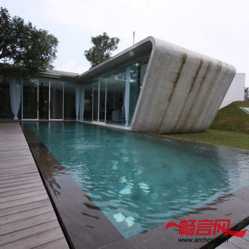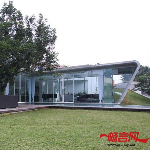 建筑的后部是家庭空间,这里的幕墙更有流动线条美。