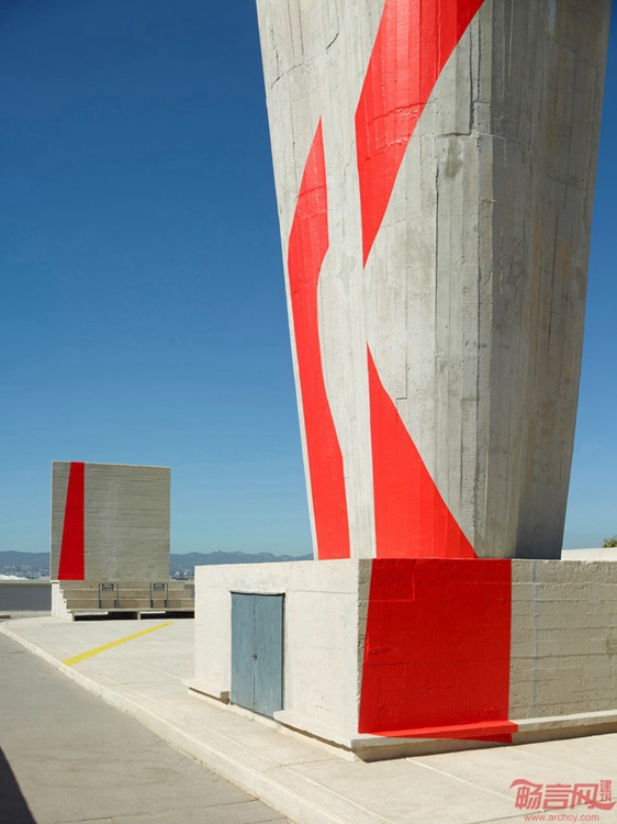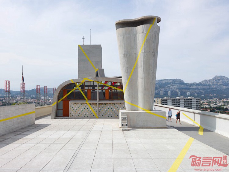 MAMO露天艺术中心位于马赛住宅上方。项目由柯布西耶1952年设计,2013年,屋面被Ora Ito改造成展览区,现在邀请Felice Varini让露台展现出不同的建筑风貌。跟随着Veilhan的脚步,Varini通过夸张大胆的绘画,为露台增加了新的视角。