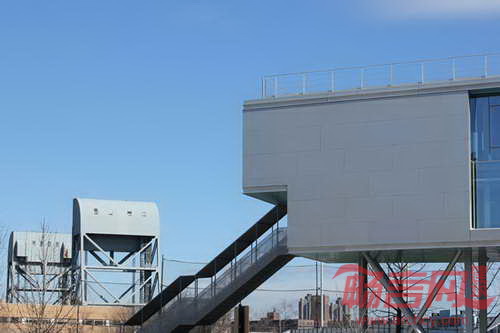 体育中心立面具有室外楼梯,支撑了连贯的流通空间。项目建筑面积达48000平方英尺,包含力量训练、校队部门行政办公室、会议室和学习室。空间构造围绕观察体育活动设计,办公室和教室位于夹层空间之上,所有楼层俯瞰最下方的室外场地。礼堂包含加大尺寸作为,适用于大块头的美式橄榄球球员。建筑一层立面采用光滑的镀锌板材和金属板,与周边砖石建筑迥然不同。