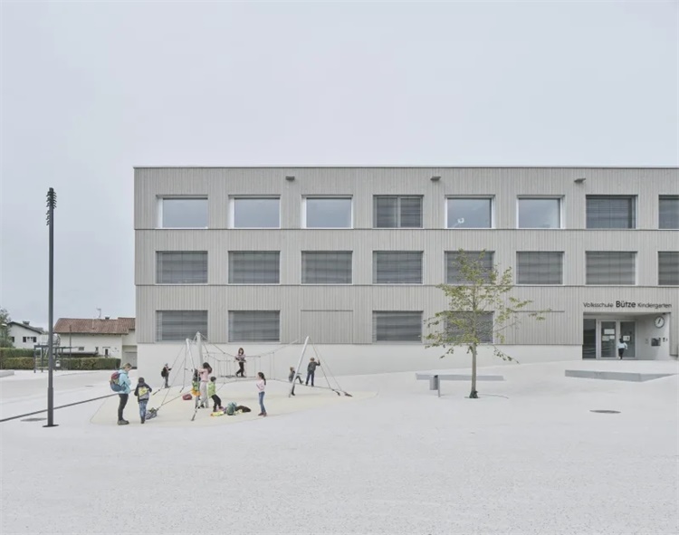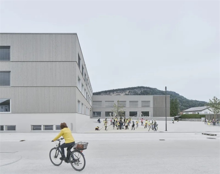 项目位于奥地利沃拉尔贝格,布雷根茨农村集镇Butze Wolfurt希望扩大其小学规模,并整合一个幼儿园和日托中心。由于结构原因,项目决定保留20世纪60年代的旧建筑,同时拆除90年代之后的部分。楼下体育馆进行了翻修重建。全新的60米长和27米高的木框架结构,每端都有一个凉棚,补充了综合建筑的整体设计。