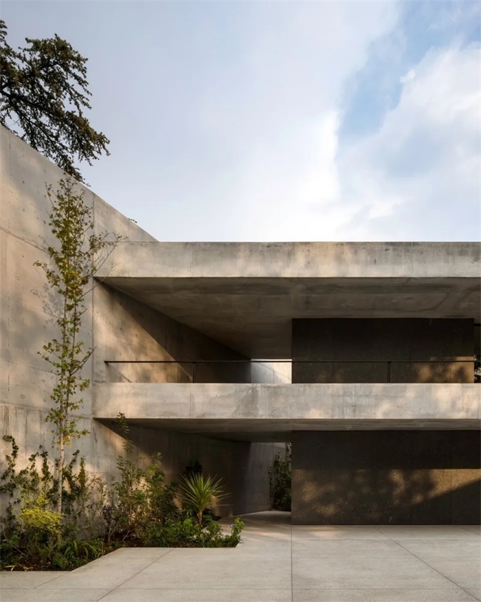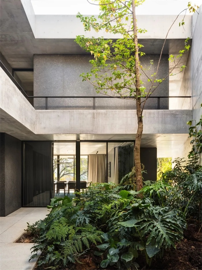 建筑内外均采用浅灰色的水磨石地面。两块混凝土板横跨整个空间,由黑色花岗岩体块支撑,体块中容纳了服务性空间。从入口庭院穿过住宅到达下方花园的小路,植被遍布其中。