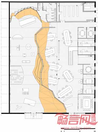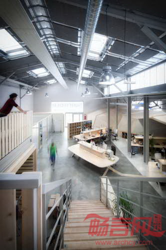 非营利环境机构SURFRIDER FOUNDATION总部位于两栋现有建筑内。项目对现有建筑进行了清理和整顿,将围护结构改造成符合2012年新保温规定的形式,取出石棉材质屋顶,以钢制夹芯板代之,并涵盖所有技术流设备。新办公空间面积达1000平米,满足了办公需求,包含教育展示功能区、容纳60人办公的第三活动区。办公楼内部安装的波浪形木质隔断两端是两个不同工作区。隔断材料采用船舶和铁路制造业常用的复合木质夹芯板。隔断具有良好隔音性,保证两区域在统一空间下分别有序地办公。