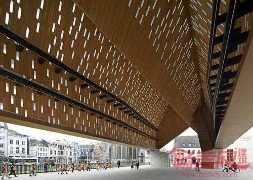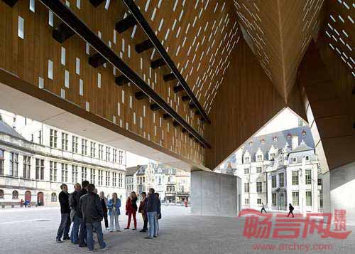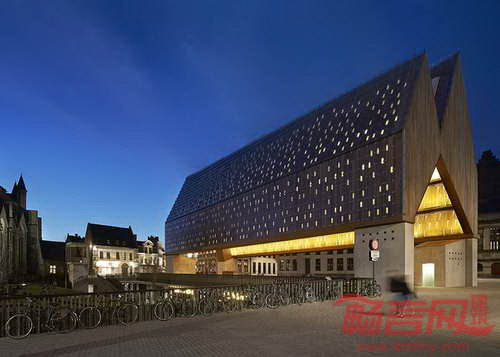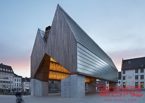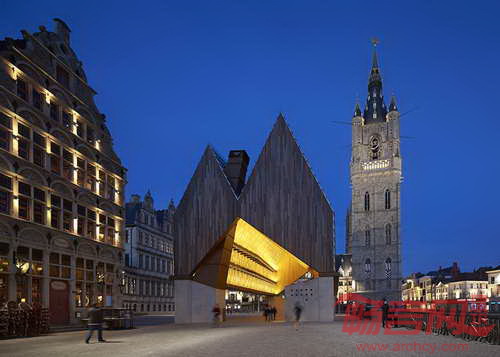 比利时根特城市中心集市厅由Robbrecht en Daem和Marie-Jose Van Hee共同设计,建筑的双三角墙和混凝土结构参考了附近市政厅的形式,为哥特派教堂和钟楼之间搭建起宏大的遮蔽场所。