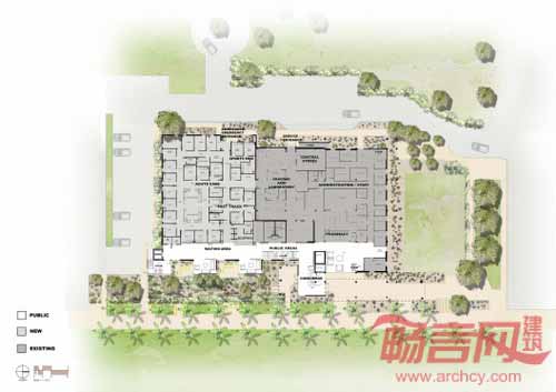 中心新正门设有景观庭院和遮阳门廊,欢迎顾客的到来。增建部分的其他区域与原有设施的尺度相称,采用了类似于原有建筑的材料,形成完整统一的整体形象。