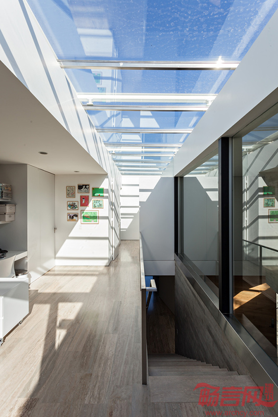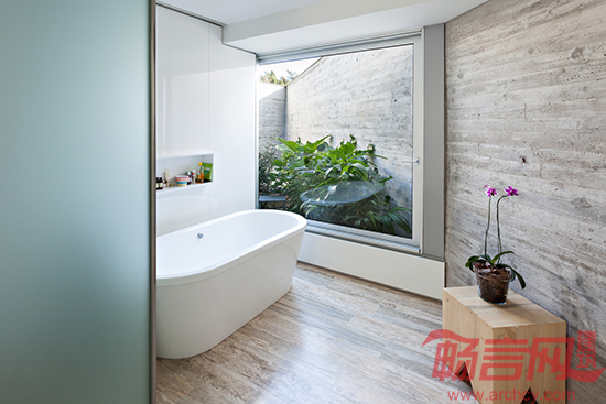 别墅的正面被解构成两个平面,形成一个“死胡同”几何结构,只有日照光线可以透过去,但是视线不能穿过。周围地貌是人工建造的,没有任何引人注目的东西,但是别墅内部有另一番景致:天井里种满了绿植,阳光照耀下别有洞天。