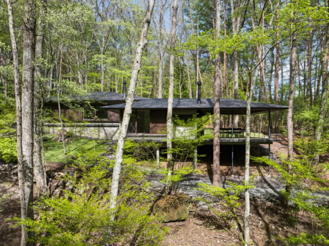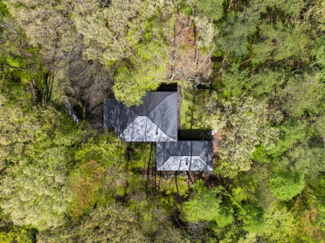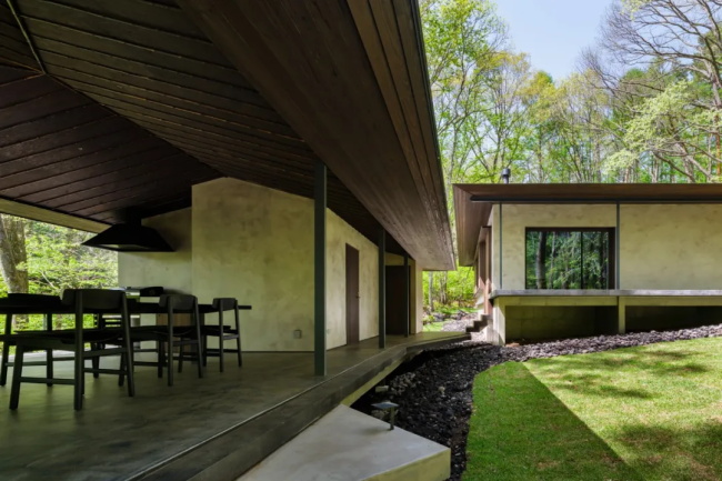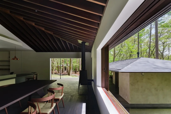 建筑由别栋、主屋、工房三部分构成。"别栋"为悬挑于斜坡之上的设计,可俯瞰沿基地流淌的谷川,营造出悬浮感,包含外居室、客房和浴室。这是一个能最大程度感受自然气息、以接待宾客为主要功能、侧重夏季使用的空间。与之相对的"主屋",在这片自然环境中承担着"庇护所"的角色。它由可作为安心隐居之所的静谧内居室和卧室组成,通过受限的开窗设计截取山林景致,设有能将外部生活气息引入的土间,配合全屋空调系统,成为适合家族全年舒适居住的场所。