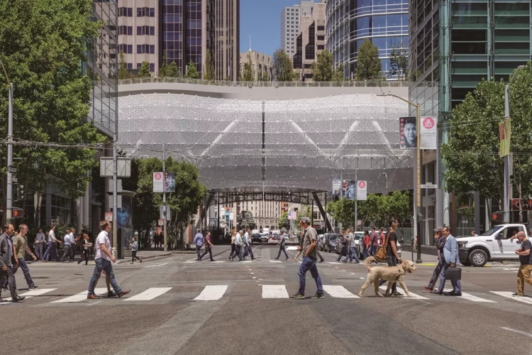 新的客运中心沿着米慎街(Mission Street)连绵延伸五个街区,直达旧金山金融区以南。从远处可以看到一面起伏的幕墙漂浮在街道上方,营造出优雅、明亮而温馨的意象。在街道层面上,商店和餐馆吸引着参观者,并为周边社区注入活力。而在高处,屋顶公园的花卉草木邀请人们驻足流连,从而把客运中心从一个通勤枢纽转变成为都市目的地。