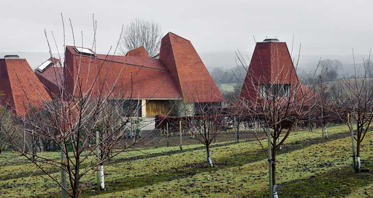 2017年,RIBA住宅奖的得主滑落一个当代英国乡村住宅。这一奖项每年颁发给英国设计师完成的最佳翻新和新建住宅。今年得奖项目由James Macdonald Wright和Niall Maxwell完成,住宅位于Kent郡乡间,参考该区域农村建筑设计,这些建筑过去用作啤酒花干燥。项目名为“Caring Wood”,包含四座塔楼,在环境中以不同角度矗立着。在设计过程中,设计师运用当地材料,包括手工制作的砖块,当地开采的粗糙岩石,栗子木外墙板。