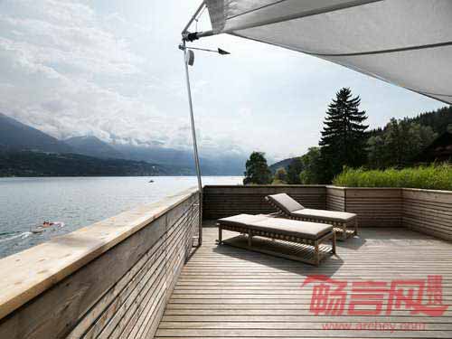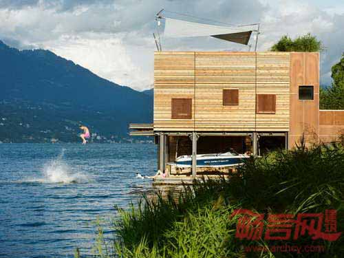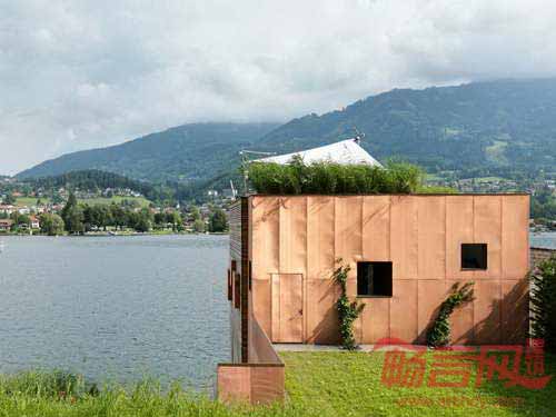 维也纳MHM建筑公司设计了位于奥地利SeebodenMillstaetter湖畔、位于水边陡坡底部一栋船屋。建筑沿水岸伸展,采用了两种材料,显示出房屋覆盖区域同地面和水面的关系。高于地面的建筑部分覆盖了铜板,而伸展如水下的部分则覆盖了厚木板。铜金属和西伯利亚落叶松条会随着时间风化,外观会相应发生改变。最终,黯淡的木材会同金属的绿锈构成反差。
