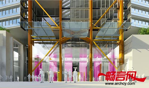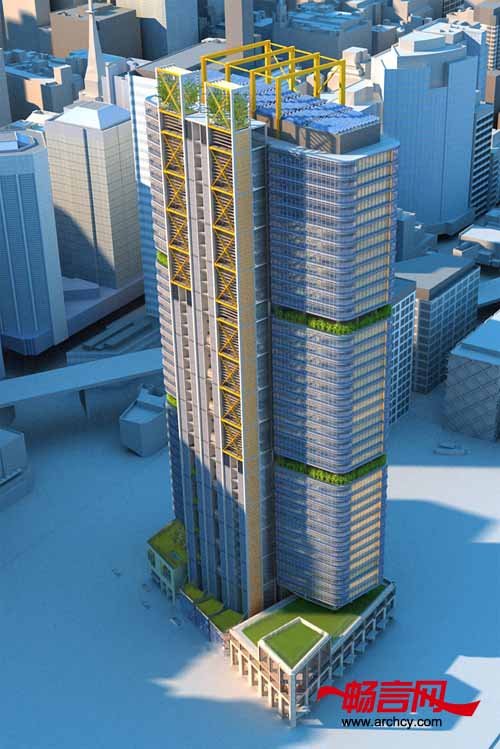 这样的设计就意味着大楼的上下流动会在楼外进行,这就使大楼的面积超过了2384平米,这也意味着C4大楼可以与悉尼的格罗夫纳广场等超级大厦相媲美了。大厦的最高几层不需要那么多的电梯,所以就可以将剩余的空间来扩展楼层。