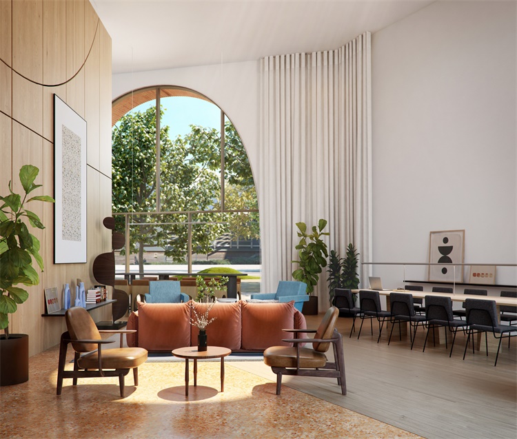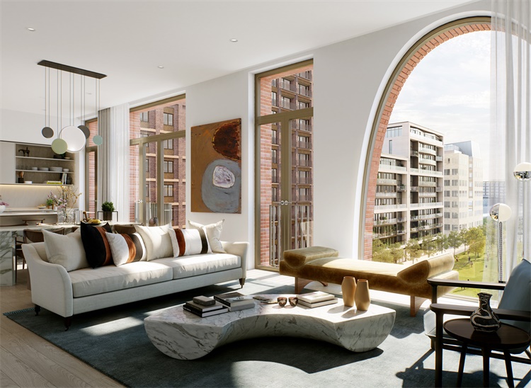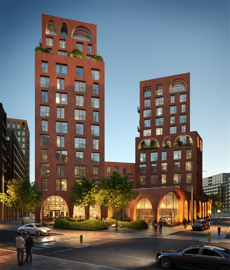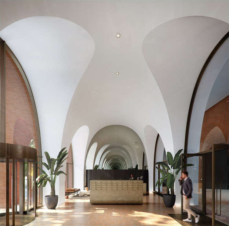 伦敦Cadence住宅项目的底层和顶层设有红砖拱门结构。由艾莉森·布鲁克斯事务所(Alison Brooks Architects)设计,位于国王十字车站的煤场旁。砖墙外墙后面将建造103座房屋。戏剧性的砖拱门形成柱廊,沿一楼而设,中央庭院设立了水景。入口处营造了白色拱形公共空间。拱门还出现在多层公寓顶部,公寓有一排嵌入式阳台。