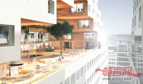 该设计高效地浓缩了灵活的办公空间,并通过建造一个封闭型空中花园优化了住宅空间的风景视角和拓展了室外空间。办公楼层的设计采取了不同的布局组合,巧妙地将空间从露天景观过渡到了办公场所。