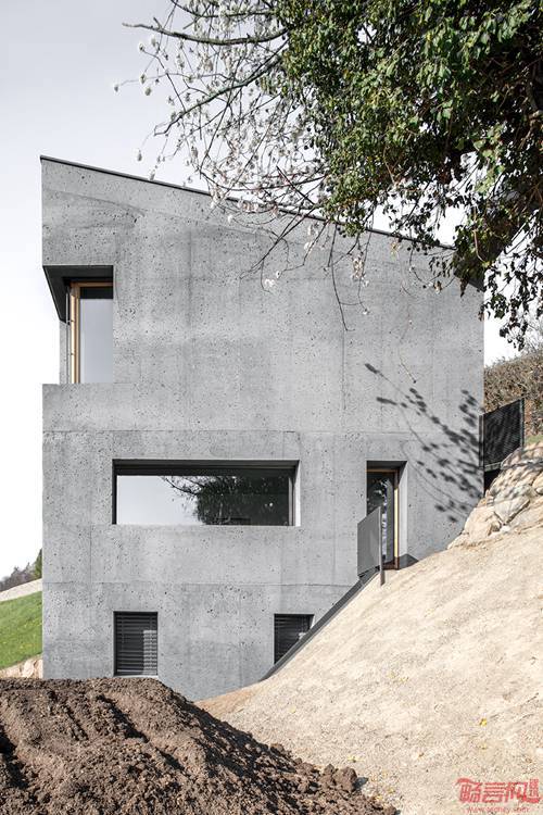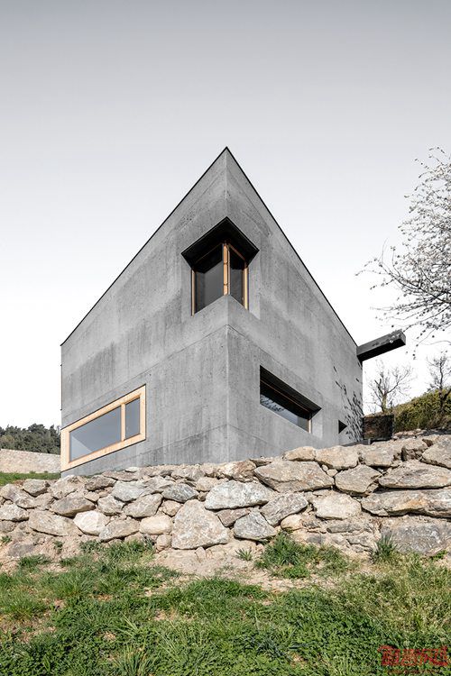 由Andreas Gruber事务所设计的住宅位于意大利Barbian一个小型社区内。和一般建造在陡坡上的房屋通常都是田园牧歌式,具有壮观的视野,俯瞰Schlern雪山和Plose峰顶。周边的山地背景给予设计师灵感,将建筑设计成巨石的形态。地区常见的一种斑石带有深灰色调,而铁锈色的花岗岩也在阿尔卑斯山一带相当普遍。因此,新建住宅的选材也旨在同当地天然岩石种类建立联系,人造材料也在自然界中有其根源。