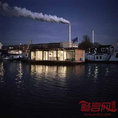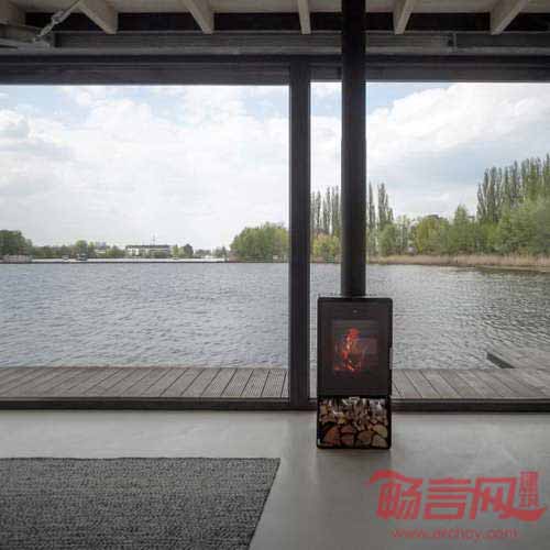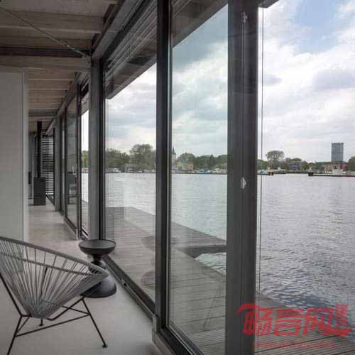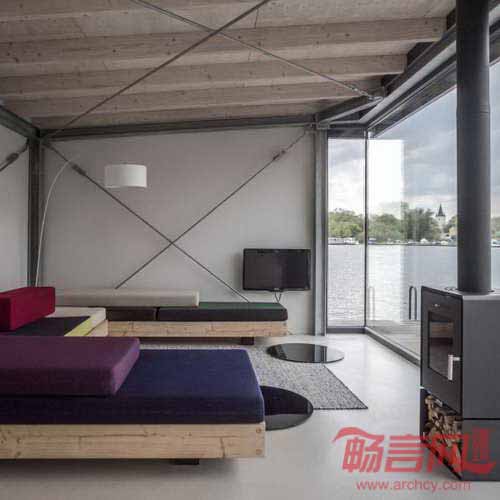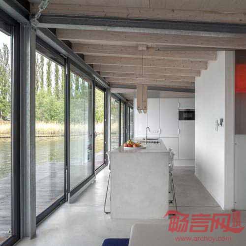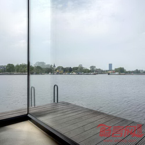 船屋的正面采用全玻璃结构,面向河湾景致,可以欣赏到著名的电视塔。