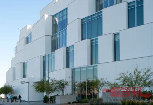 这座耗资1亿美元的综合性建筑由两个侧楼组成,中间由一个开放型庭院进行连接:专科研究中心位于该建筑的北端;被命名为“生命活动中心”的“用于租赁”的空间位于该建筑的南端。建筑形态大不相同的两个空间共同形成了一个整体。设有医疗办公室、病房和研究空间的4层的医疗中心的设计非常合理。灰泥,玻璃和一系列堆叠的白色块构成的外墙使得该建筑呈现出传统的直线几何结构。对比之下,“生命活动中心”就如同一个奔腾的雕刻体,位于典型的Gehry式不锈钢屋顶下。作为一个活动空间,“生命活动中心”可租用于聚会、婚礼和特殊活动,租金则用于支持鲁沃脑健康中心进行研究。