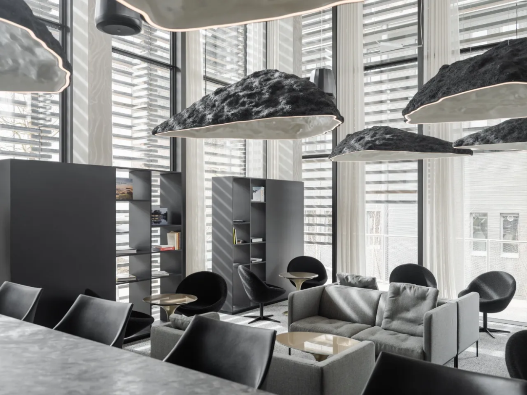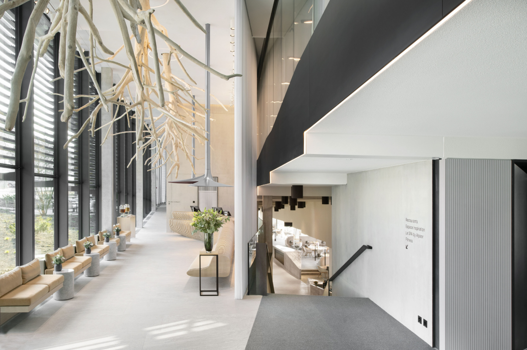 建筑师努力将酒店与周围环境融为一体,法国当代建筑机构 AUM 在室内设计中同样非常出色。通过石材或木材等当地材料,将客人带入茹克斯河谷的自然之中。大堂的天花板倒挂着白色树干,如同茹克斯湖中倒映的森林;大型的灯具仿佛剖切开的石头,与侏罗山脉的山地轮廓相呼应。