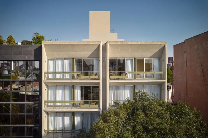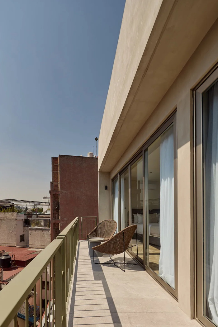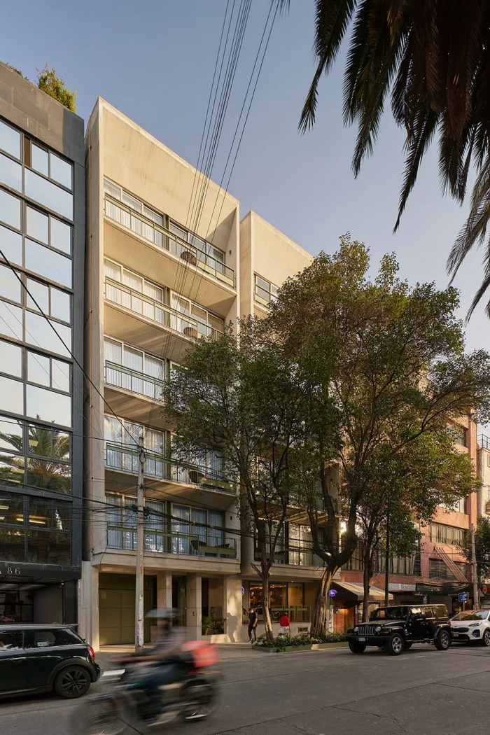 Oaxaca 88大楼位于墨西哥城Condesa街区,是一座融入充满活力的城市环境中的混合功能建筑。项目包含26套住宅单元及一层临街商业空间,由两个体量构成,并通过中央垂直交通核心相互连接。建筑的结构模数在立面上得到清晰呈现:北立面分为两个板块,南立面则划分为三个部分,呼应了公寓内部的布局逻辑。建筑材料以清水混凝土为主,结合绿色金属构件,并配有宽敞的阳台与露台,可远眺城市地标。