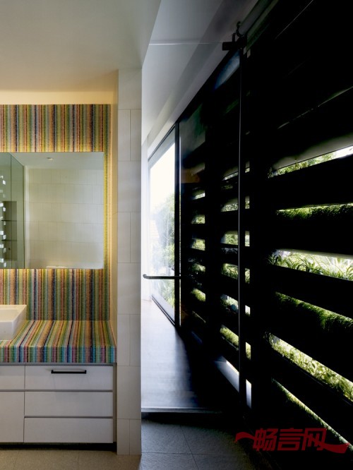 受景观建筑师Burle Marx的灵感启发,垂直墙壁植物被种植在前边的围墙上,而灌木林则被种植在汽车库的门廊顶上,这些都是人们通常会忽略掉的园林绿化方法。