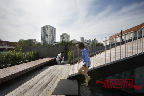倾斜的屋顶平台源于住宅相互交错的结构,保持了同室内空间的连通,同时让人联想到了起伏的波浪。
