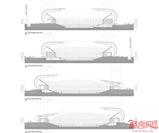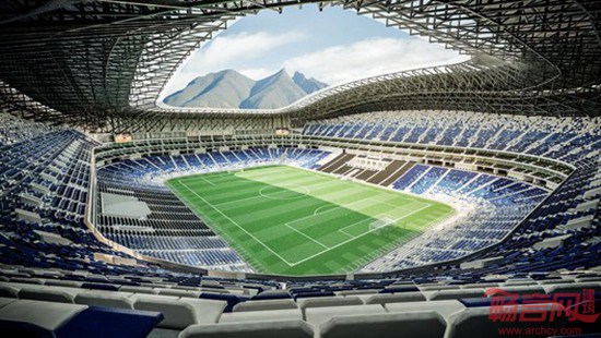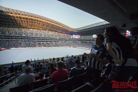 Populous工作室设计了墨西哥Monterrey的BBVA BANCOMER体育场。项目面积18.7万平米,于2015年完工。项目设计超出了人们对于南美球场的期待。受到地区历史悠久的酿酒业和钢铁制造业启发,体育场采用自持型三角结构,在外形上具有雕塑感,覆盖了圆形的铝面钢制桁架,对曾经兴旺的钢铁业致以敬意。酿酒业影子反映在球场的不对称轮廓上,南侧顶棚偏低,让观众可领略巍峨的Cerro de la Silla山峰。
